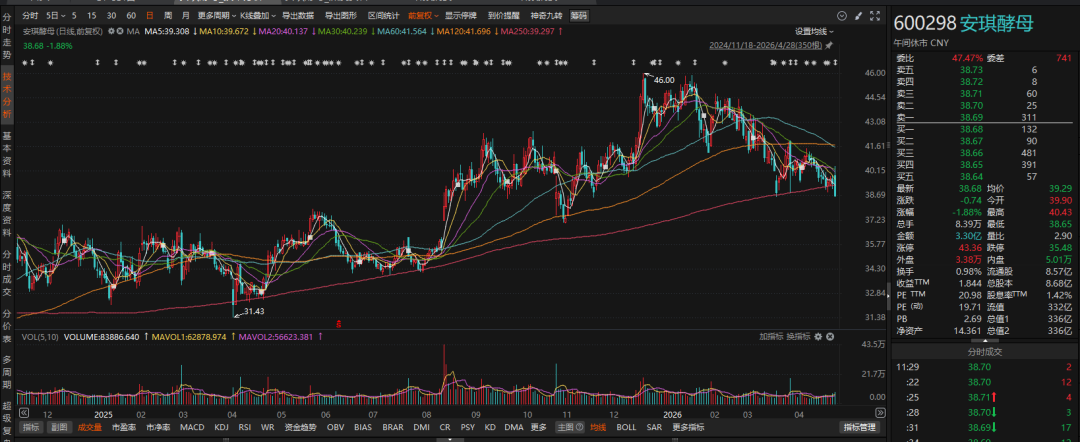 业绩亮眼背景下,安琪酵母股价去年震荡向上,2025年股价涨幅为23.19%,一季度股价则小幅调整,跌幅为7.61%。