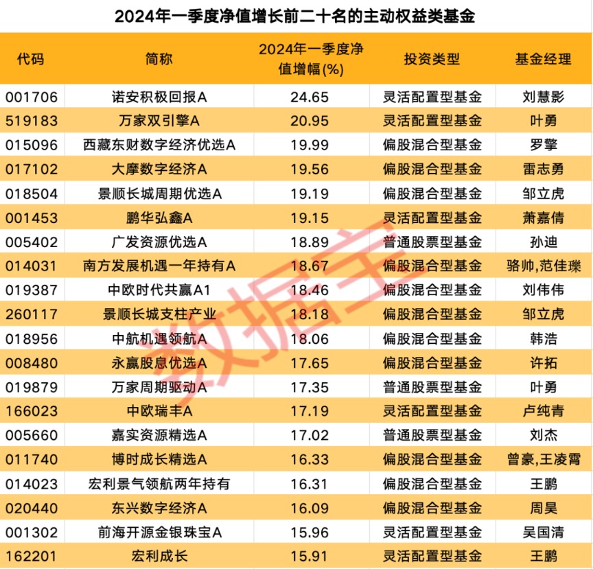 证券时报·数据宝统计,在全市场的主动权益类基金(普通股票型、偏股混合型、平衡混合型、灵活配置型)中,共计24只主动权益类基金一季度净值增幅超过15%。诺安基金基金经理刘慧影管理的诺安积极回报A净值增幅居首,为24.65%;万家基金叶勇管理的万家双引擎A是另一只净值增幅超过20%的基金;2只基金规模依次为8.53亿元、15.37亿元。此外,西藏东财数字经济优选A、大摩数字经济A、景顺长城周期优选A、鹏华弘鑫A基金净值增幅也均超过19%;这些基金规模相对较小,均不足2亿元。