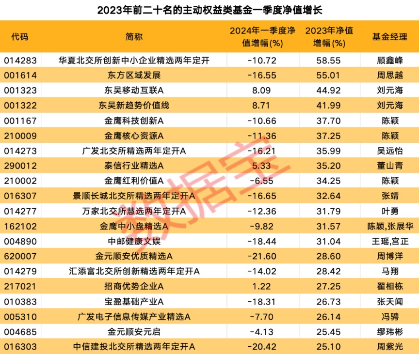 今年一季度,24只主动权益类基金表现出色。